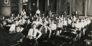 But the advent of factories and assembly lines called for a new interpretation of Mann’s original “Common School.” The schools got bigger so they could fit more students. They wanted more students in one building because it was less expensive. The invention of the assembly line in the early 1900s prompted a reinterpretation of public schools, using efficiency and cost-effectiveness as their lenses. But they didn’t lose the fundamental process: a single teacher instructing many students; focusing on the “Three Rs,” history; younger kids sat in front, older ones in back; and everyone learned through repetition, oral recitation, using slates and chalk, with harsh discipline.