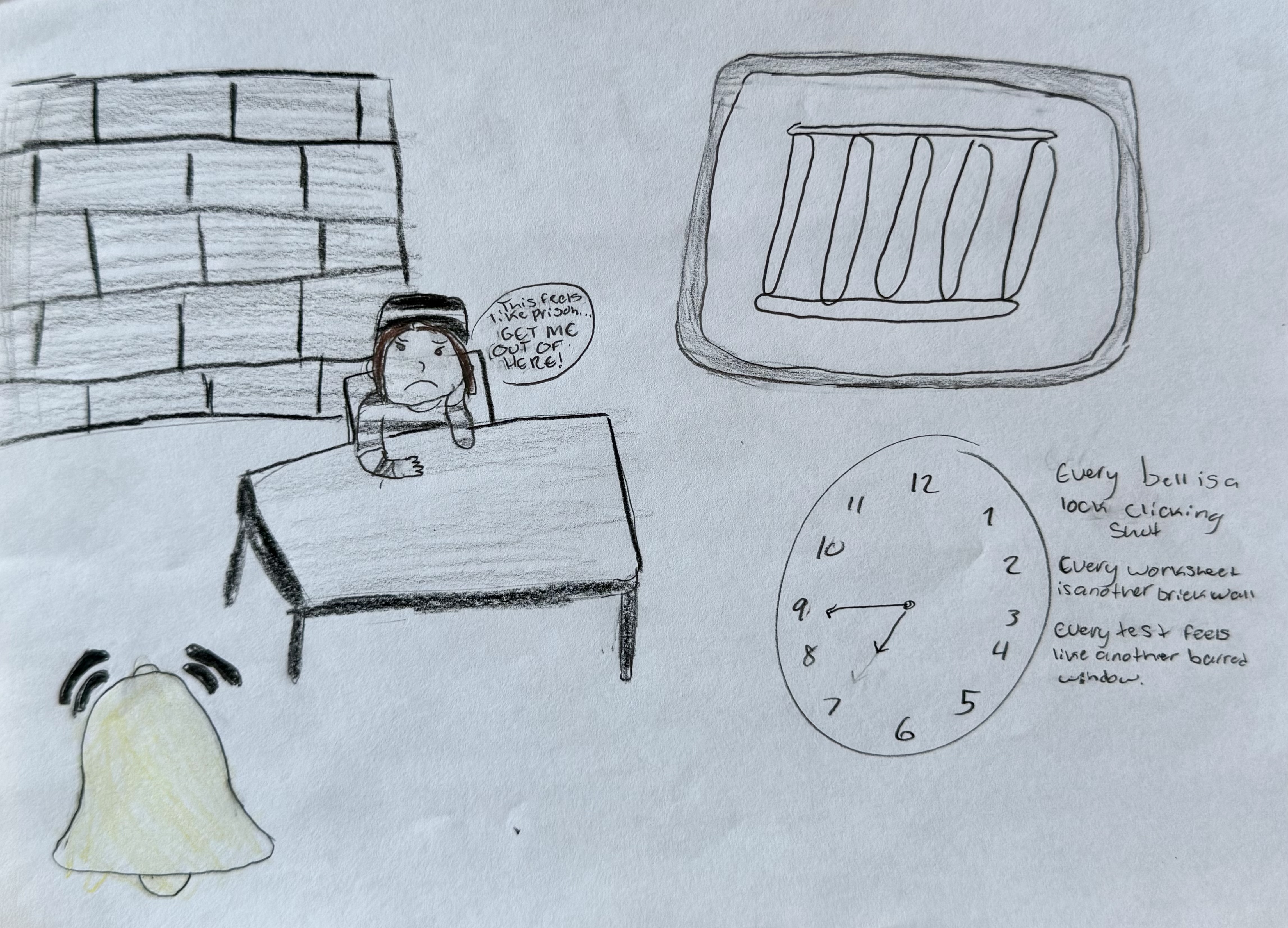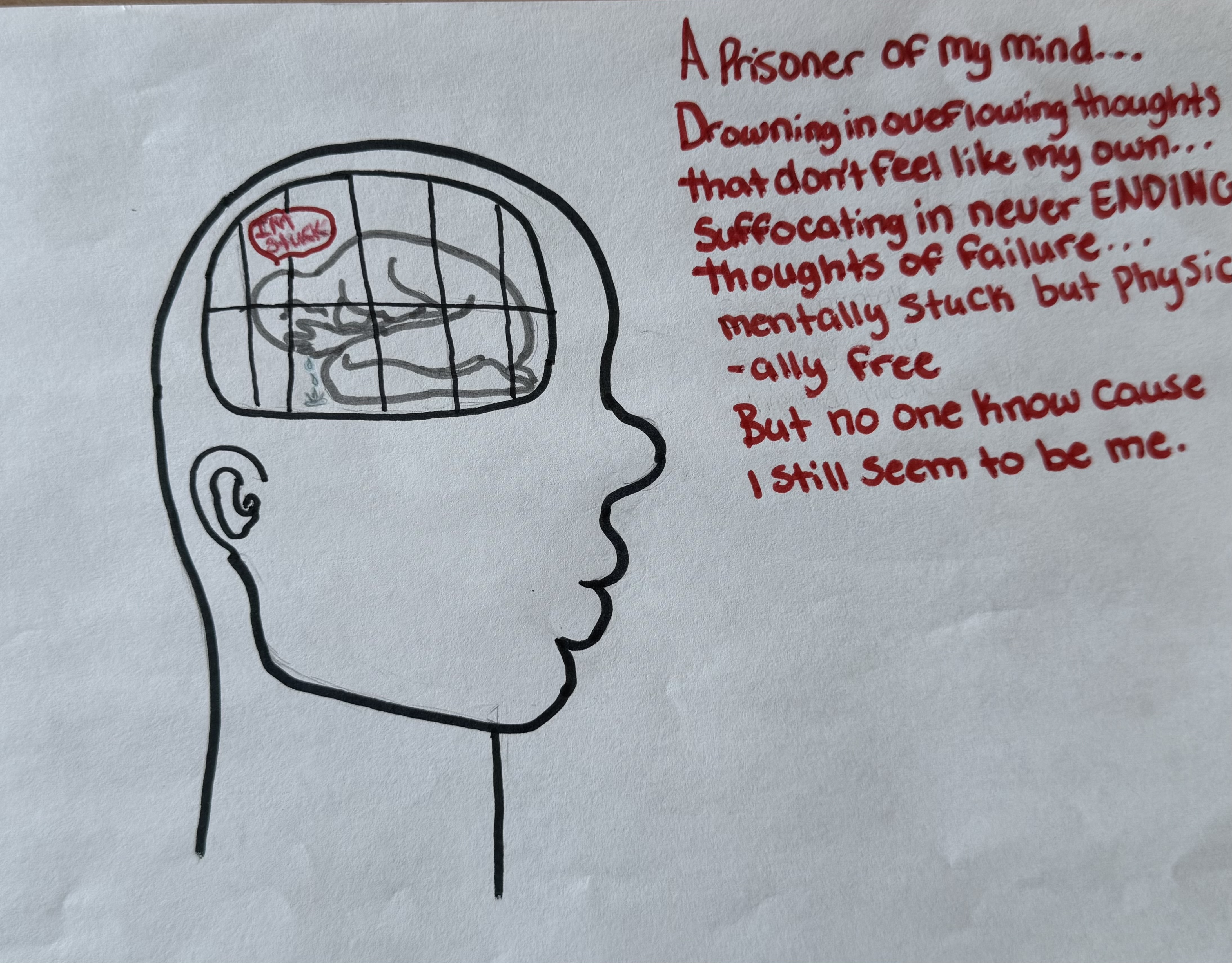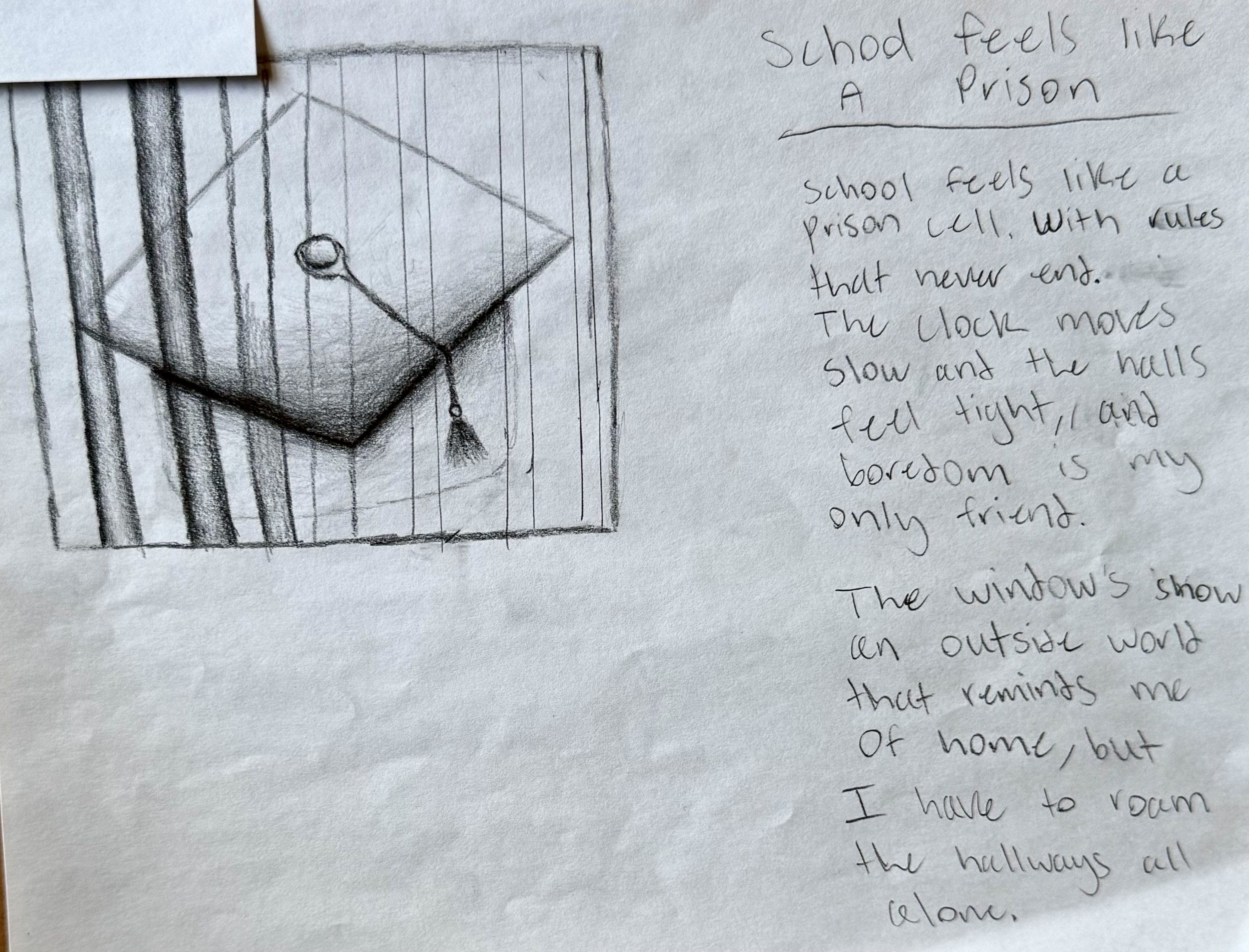 In the student work below, their assignment was to create any piece of art or writing in any form that expresses a metaphor for a prison they experience in their lives. They range from immigrants who are in America as refugees to students coping with mental illness.
