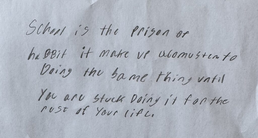 What’s best for kids is not different from what’s best for adults. Like adults, children want to be respected. They want their dignity. They need purpose and agency to feel motivated. They don’t thrive in an environment that is physically inactive, informationally repetitive, routinely predictable, and stifling. Certainly not people in the adolescence stage of development whose curious minds are built for discovering their identity and where they fit into the world.